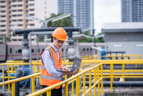 Engineer take water from wastewater treatment pond to check the quality of the water after going through program wastewater treatment process in industry environment concept.