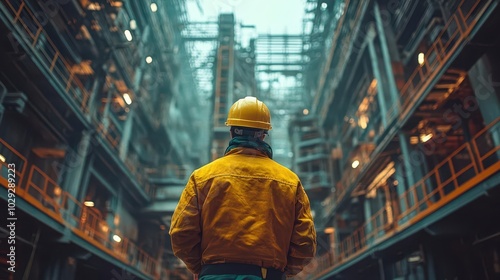 engineer technician observes a team of workers on a high steel platform focused on collaboration and safety amidst an industrial backdrop the scene conveys teamwork and the essence of engineering