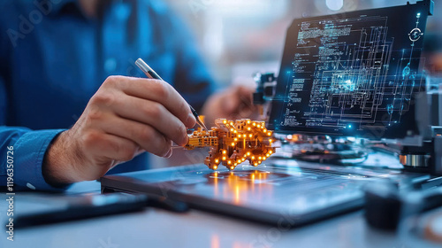 Engineer using 3D printer to create detailed prototype model, showcasing advanced technology and innovation in design. workspace is modern and high tech