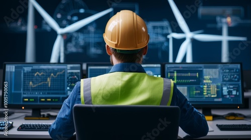 Engineer using diagnostic software to optimize wind turbine performance, energy-efficient design, high-tech control center with multiple screens