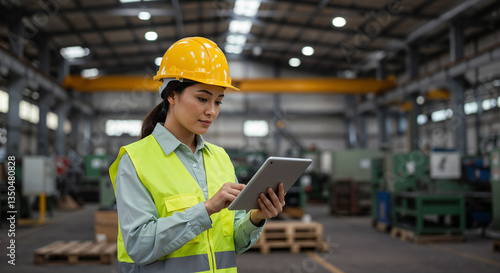 Engineer wearing a hard hat and safety vest works on a tablet in an advanced manufacturing facility, showcasing technology integration in industrial environments and operational efficiency