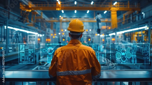 Engineer wearing safety gear, analyzing futuristic digital interfaces in a high tech manufacturing facility at nighttime.