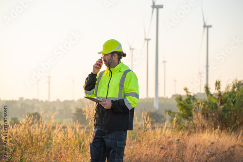 Engineer wearing uniform inspection and survey work in wind turbine farms rotation to generate electricity energy. Maintenance engineer working in wind turbine farm.