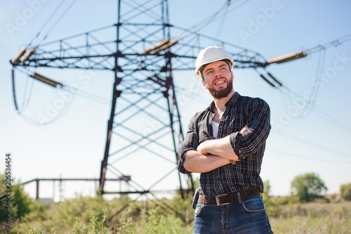 Engineer with white hard hat under the power lines.Engineer work at an electrical substation.