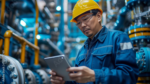 Engineer worker inspecting an industrial pipeline in a large factory.