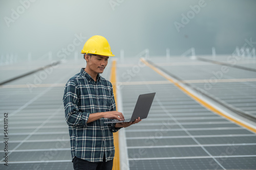 Engineer worker technology solar cell, Asian engineer working on roof top factory checking solar cell power system for project reduce usage electricity in factory