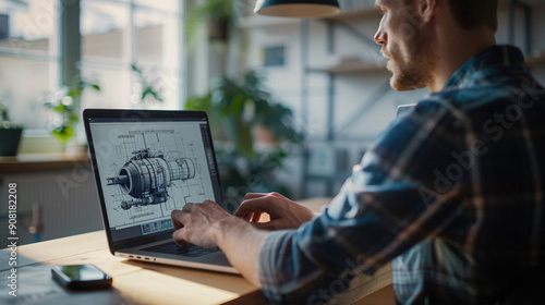 Engineer working on a laptop with technical drawings of mechanical components, demonstrating focus and technical skills in a professional workspace, ideal for technology and engineering themes