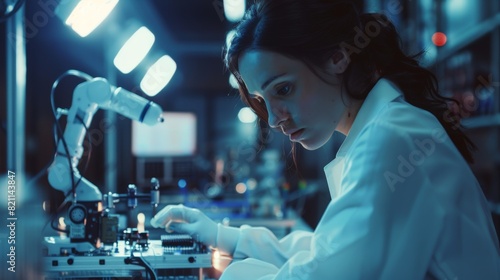 Engineer working on circuit boards on blurred background. Industrial Robotics Specialists in lab coats working on a mobile artificial intelligence robot in a tech factory.