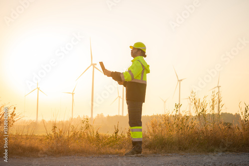 Engineer working on laptop in front of wind turbines for checking wind turbines of the field during beautiful sunset. Alternative energy concept.