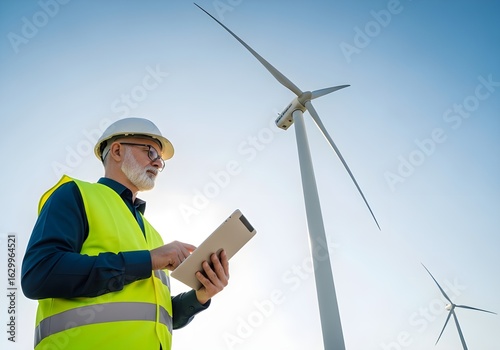 Engineer Working on Wind Farm: Technician Using a Digital Tablet to Monitor a Wind Turbine for Renewable Energy