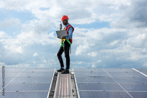 Engineer working setup Solar panel at the roof top. Engineer or worker work on solar panels or solar cells on the roof of business building
