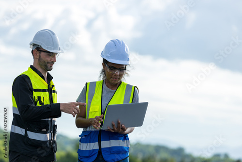 Engineer working setup Solar panel at the roof top. Engineer or worker work on solar panels or solar cells on the roof of business building