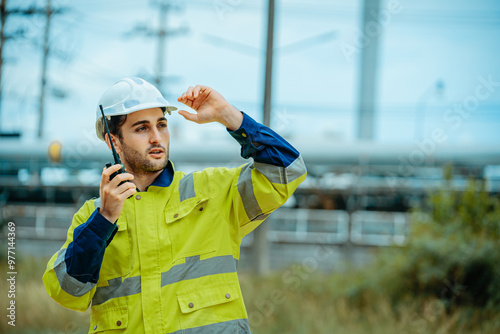 Engineer working using radio and standing in front of a petroleum industrial plant.