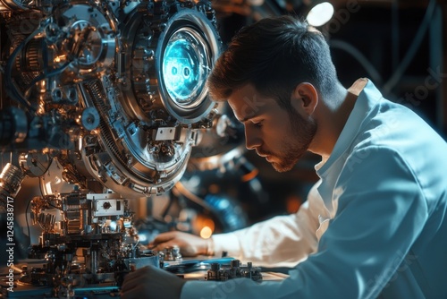 Engineer works on intricate machinery in a high-tech laboratory during evening hours