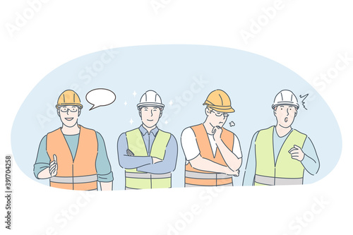 Engineering and construction workers concept. Men professional engineers, builders and managers cartoon characters in protective helmets and uniform communicating and discussing building projects
