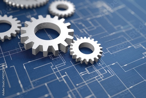 Engineering blueprints and optimization. Gears on a blueprint background representing engineering and technology concepts.
