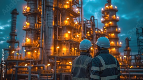 Engineering Team Collaboratively Discussing Plans in Front of a Massive Power Plant, Representing the Heart of Energy Production