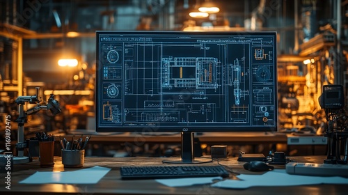 Engineering Workstation Displays Detailed Mechanical Blueprint