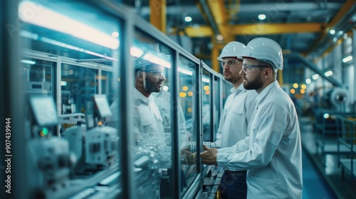 Engineers discussing software updates for factory automation systems, surrounded by high-tech machinery