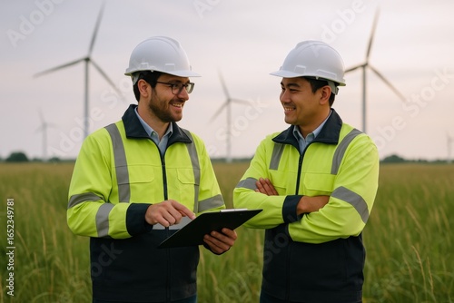 Engineers Inspecting Wind Turbine Power Plant Project Site for Renewable Energy Solutions and Sustainable Development Initiatives