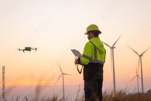Engineers male flying drone surveying and checking wind turbines from the high angle view of the field during beautiful sunset. using drone technology for work.