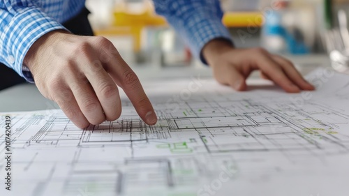 Engineers modifying the dimensions of an industrial building layout, hands moving over blueprints, close-up view