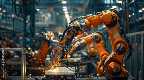 Engineers oversee and operate automated robots in a smart factory, using a monitoring system. These robots perform welding and various manufacturing tasks.