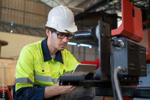 Engineers use tablet computer for machine maintenance, automation tools, robot arm at the factory.
