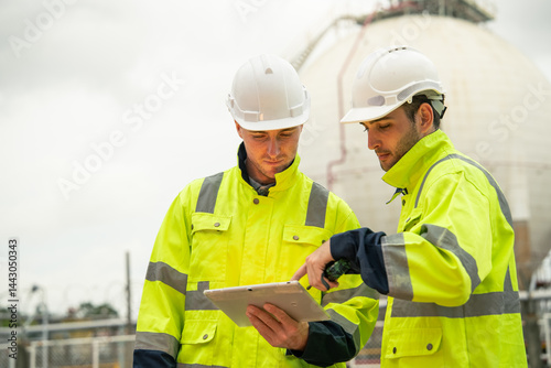Engineers wearing safety gear discussing work at an oil refinery plant. Industrial background with metal structures and pipelines. Professional teamwork and communication in the energy indust