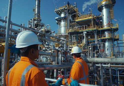 Engineers working on carbon capture units attached to a refinery, showcasing the technological complexity of the equipment