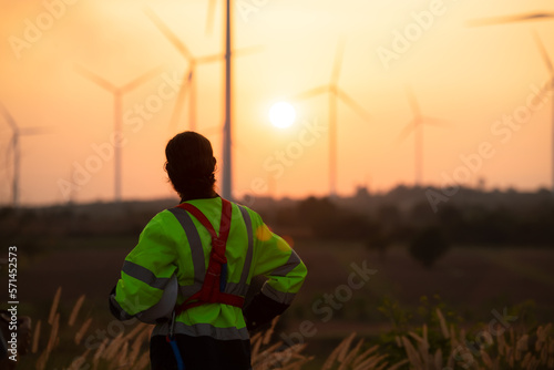 Engineers working on wind farms for renewable energy are responsible for maintaining large wind turbines. Review all tasks of the day while the evening sun shines a beautiful golden light