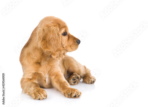 English Cocker Spaniel puppy lying and looking away. isolated on white background