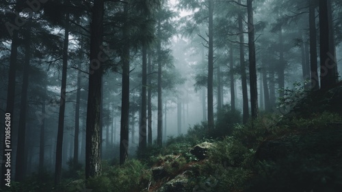 Enigmatic Foggy Forest with Mysterious Atmosphere and Cinematic Tones