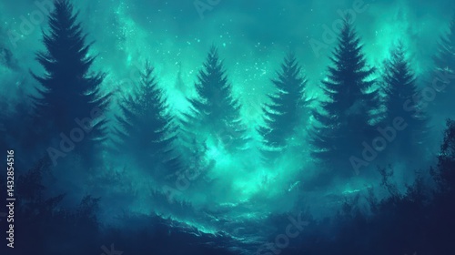 Enigmatic teal forest with serene atmosphere and distant light sparks