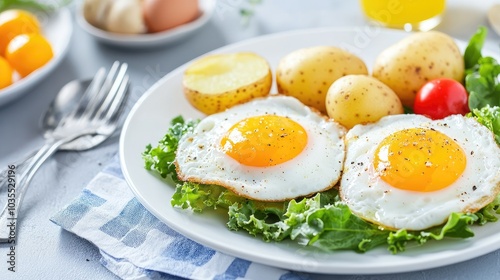 Enjoy a hearty breakfast featuring crispy potato wedges, vibrant spinach, and two sunny-side-up eggs, perfect for a nourishing start to the day