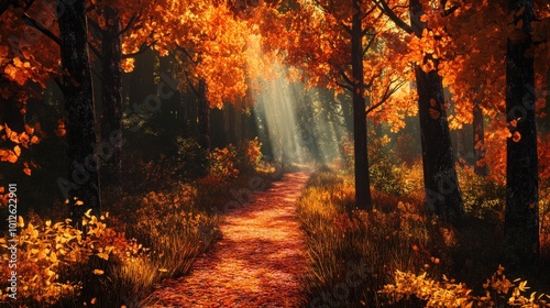 Enjoy a peaceful forest walk along an autumn path, with fiery fall colors creating a magical and calming atmosphere for a serene escape