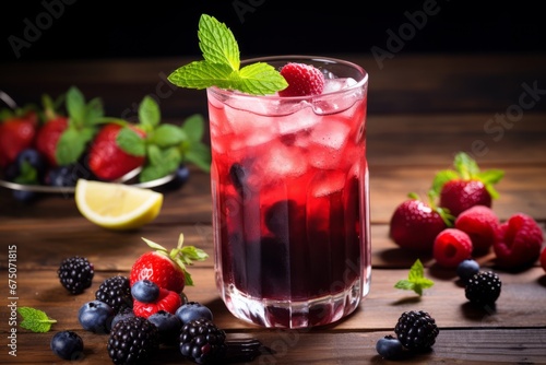 Enjoying a Cold and Refreshing Mixed Berry Lemonade Outdoors on a Rustic Wooden Table