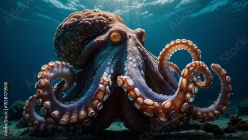 Enormous Octopus Cephalopod Relaxing on Ocean Floor Surrounded by Coral Reefs