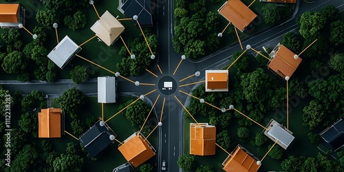 Enterprise AI Optimization concept. Aerial view of a neighborhood with connected homes, highlighting a central intersection surrounded by trees and roads.