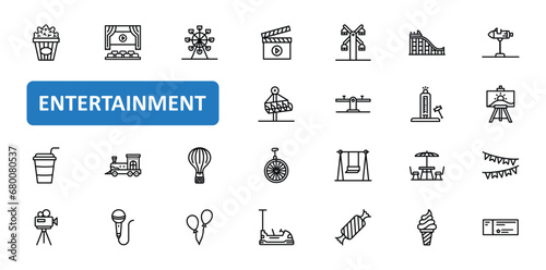 Entertainment icon set. fair, circus, park, amusement, game, cinema, movie, theater, kids, ride, coaster, decoration icons. Editable stroke thin line outline icon collection. Vector illustration