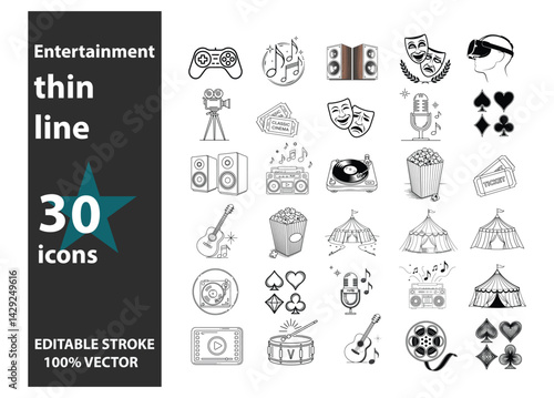 Entertainment Icons Collection Featuring Video Game Controller VR Headset Popcorn Bucket Movie Clapper and More in Minimalist Vector Style