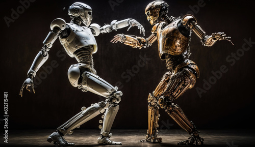 Enthralling dance scene featuring a human and humanoid robot in a softly lit ballroom exuding joy, connection, with subtle bokeh and warm tones. Generative AI