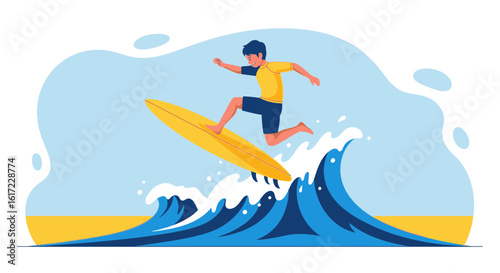 Enthusiastic Surfer Jumping High Riding a Wave for Beach Recreation