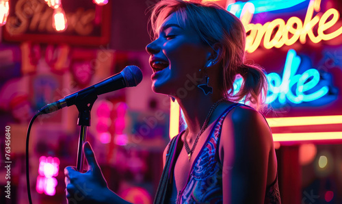 Enthusiastic young woman singing passionately into a microphone under the neon glow of a vibrant karaoke sign in a lively night entertainment setting