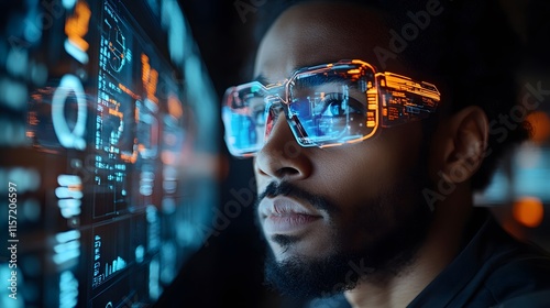 Entrepreneurs analyzing market trends with futuristic digital interfaces highlighting opportunities