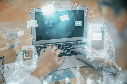Envelop hologram drawing with businessman working on computer on background. Electronic mail concept. Double exposure.
