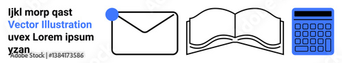 Envelope, book, and calculator with clean lines and blue accents. Ideal for communication, education, organization, digital tools, office workflow, learning resources simple landing page