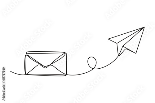 Envelope with flying paper plane in one continuous line minimalist vector sketch icon