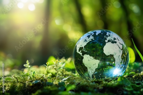 Environment Concept - Globe Glass In Green Forest With Sunlight. Blurred background.
