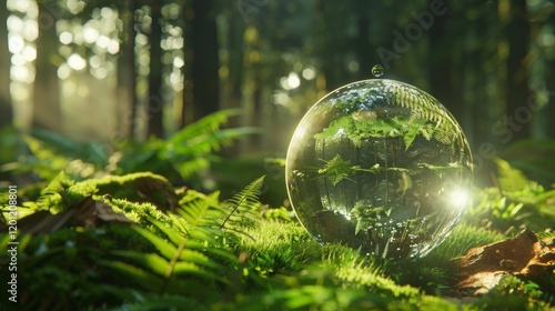 Environment Concept, ball is surrounded by green grass and trees, creating a peaceful and serene atmosphere. The sunlight is shining on the ball